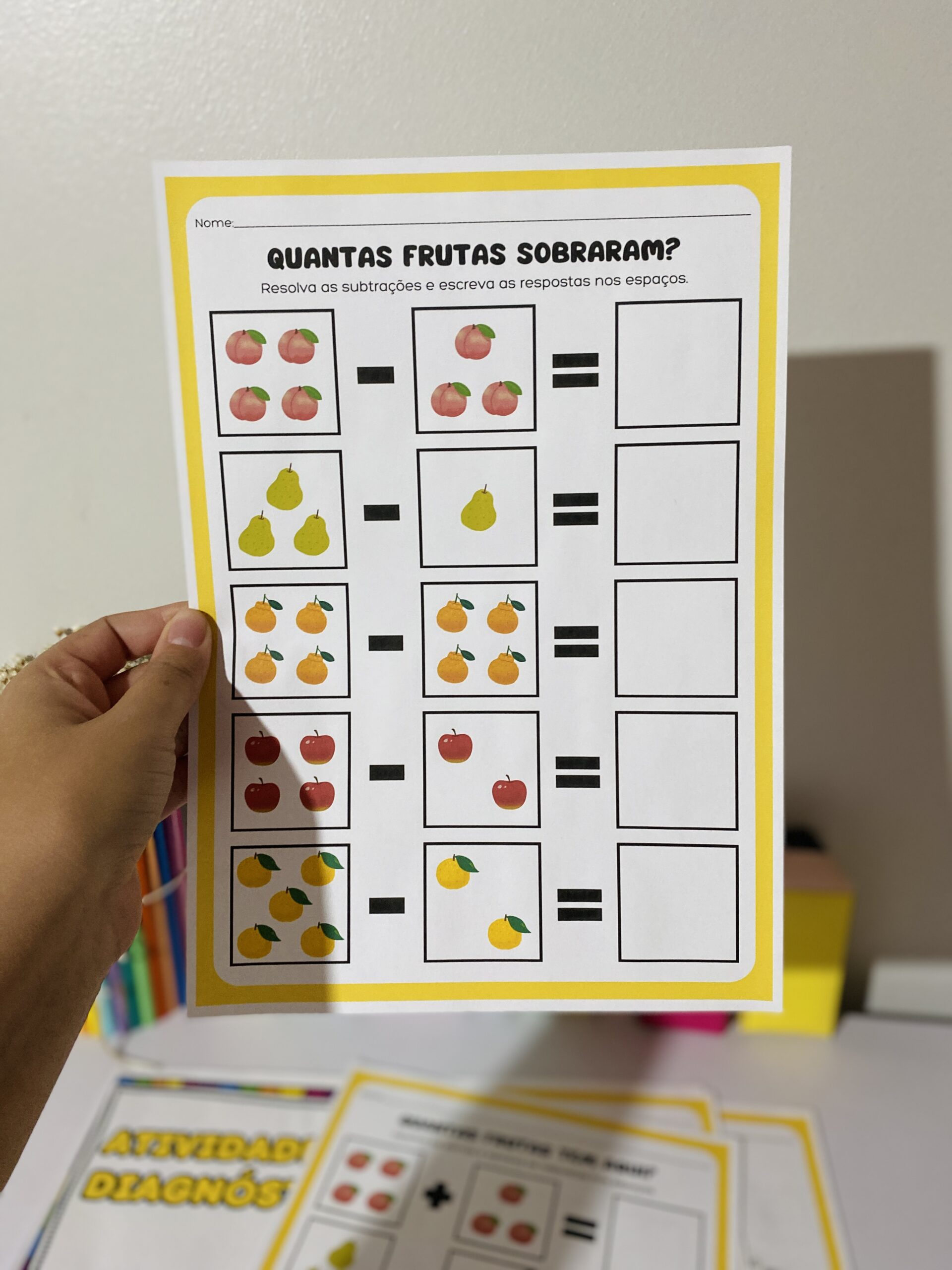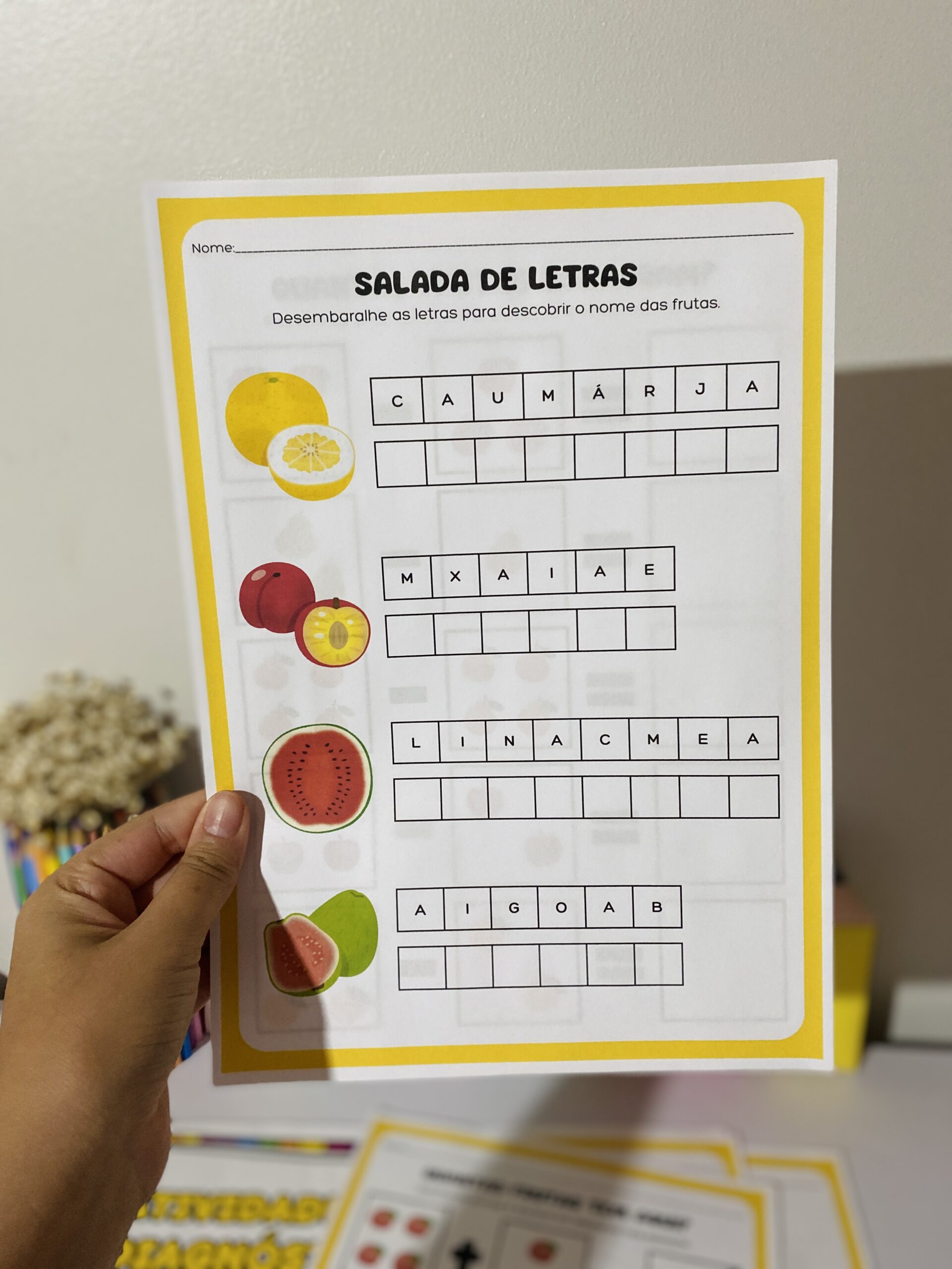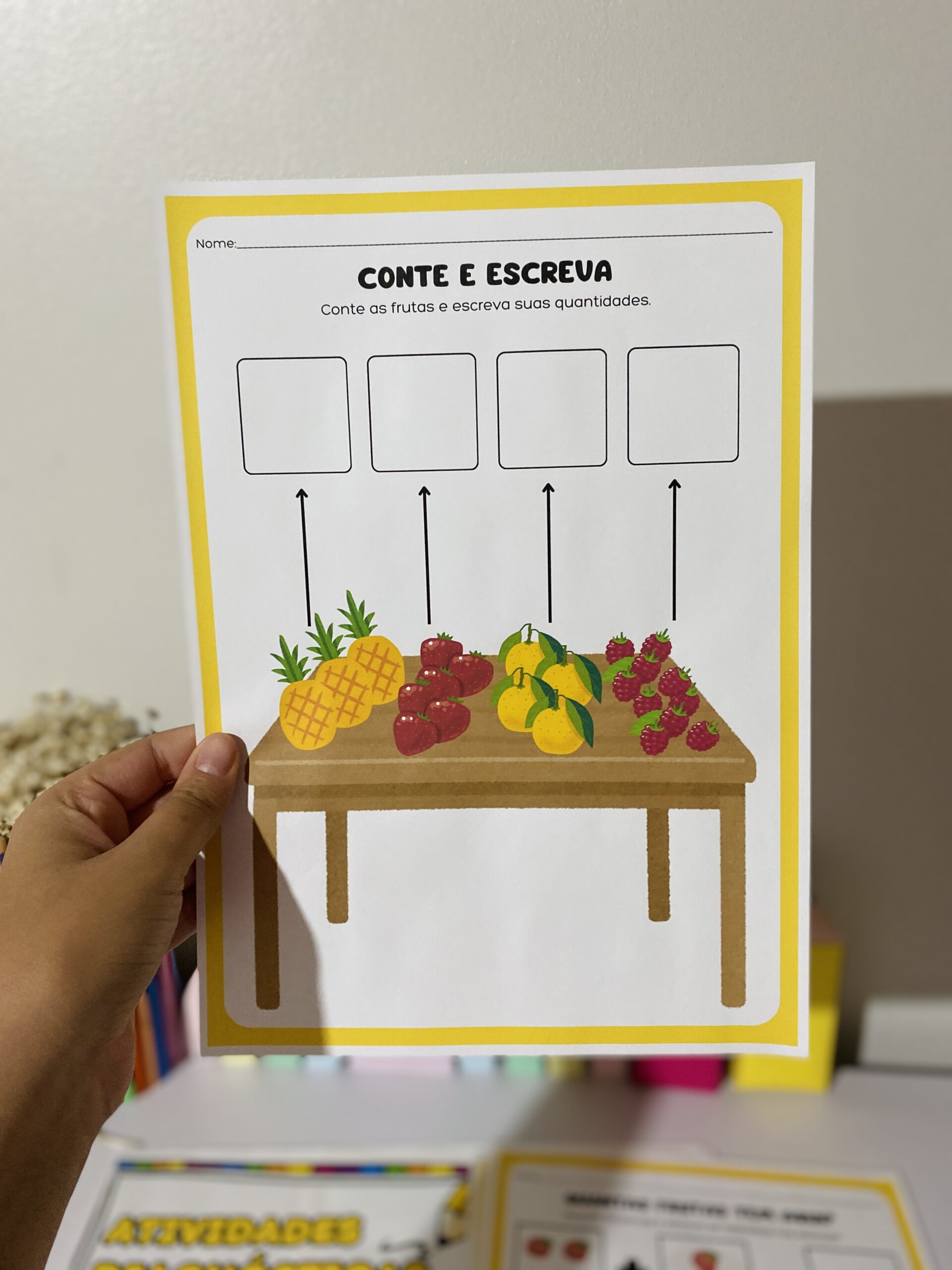 Inclui: vogais, completar palavras, alfabeto ilustrado, salada de letras, maior/menor, labirinto, sombras, contagem, adição, subtração e sudoku das frutinhas. 🍌🍓