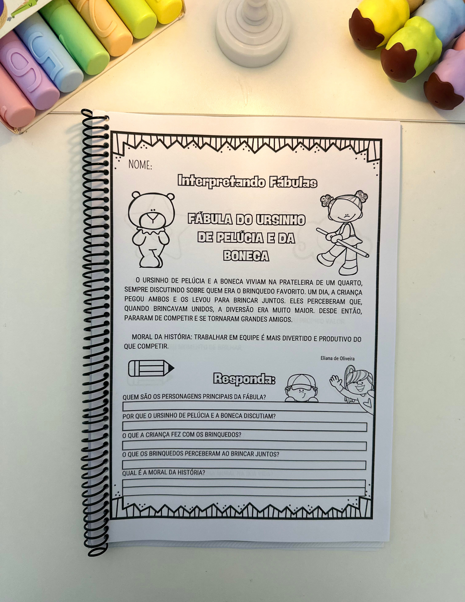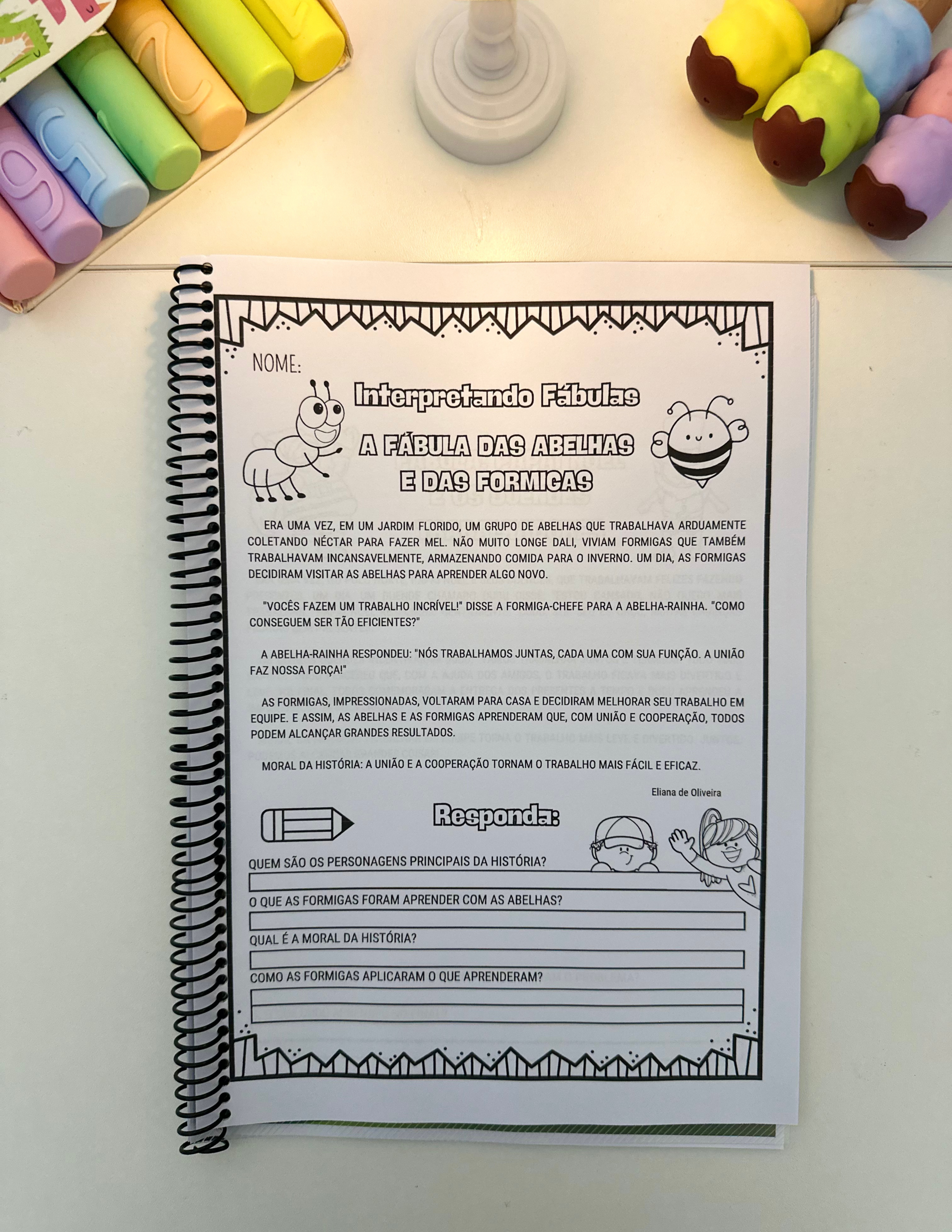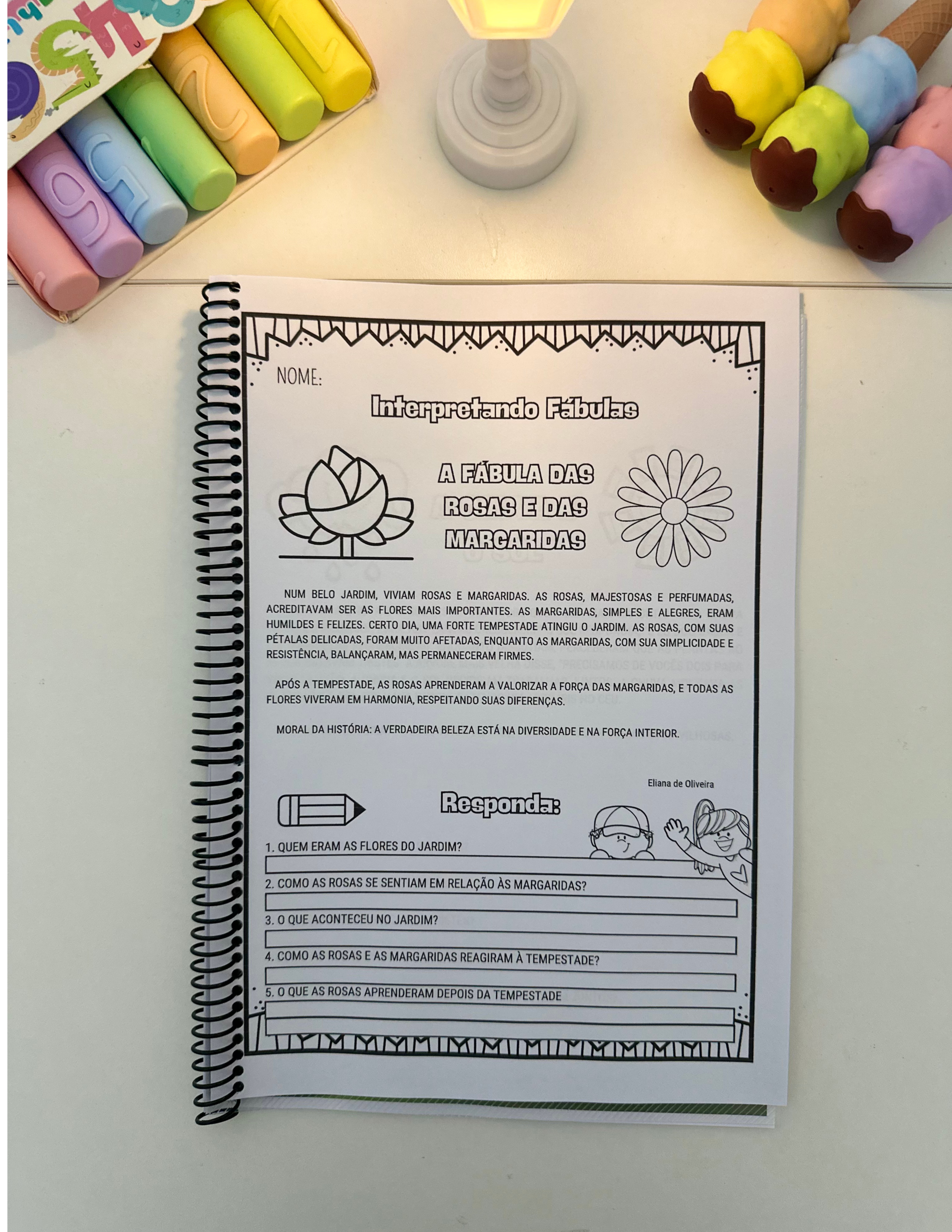 São 18 páginas ilustradas com fábulas e perguntas de interpretação, perfeitas para crianças em fase de alfabetização.