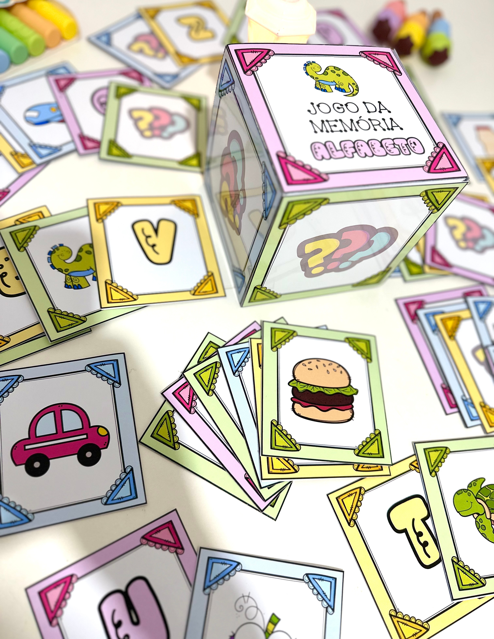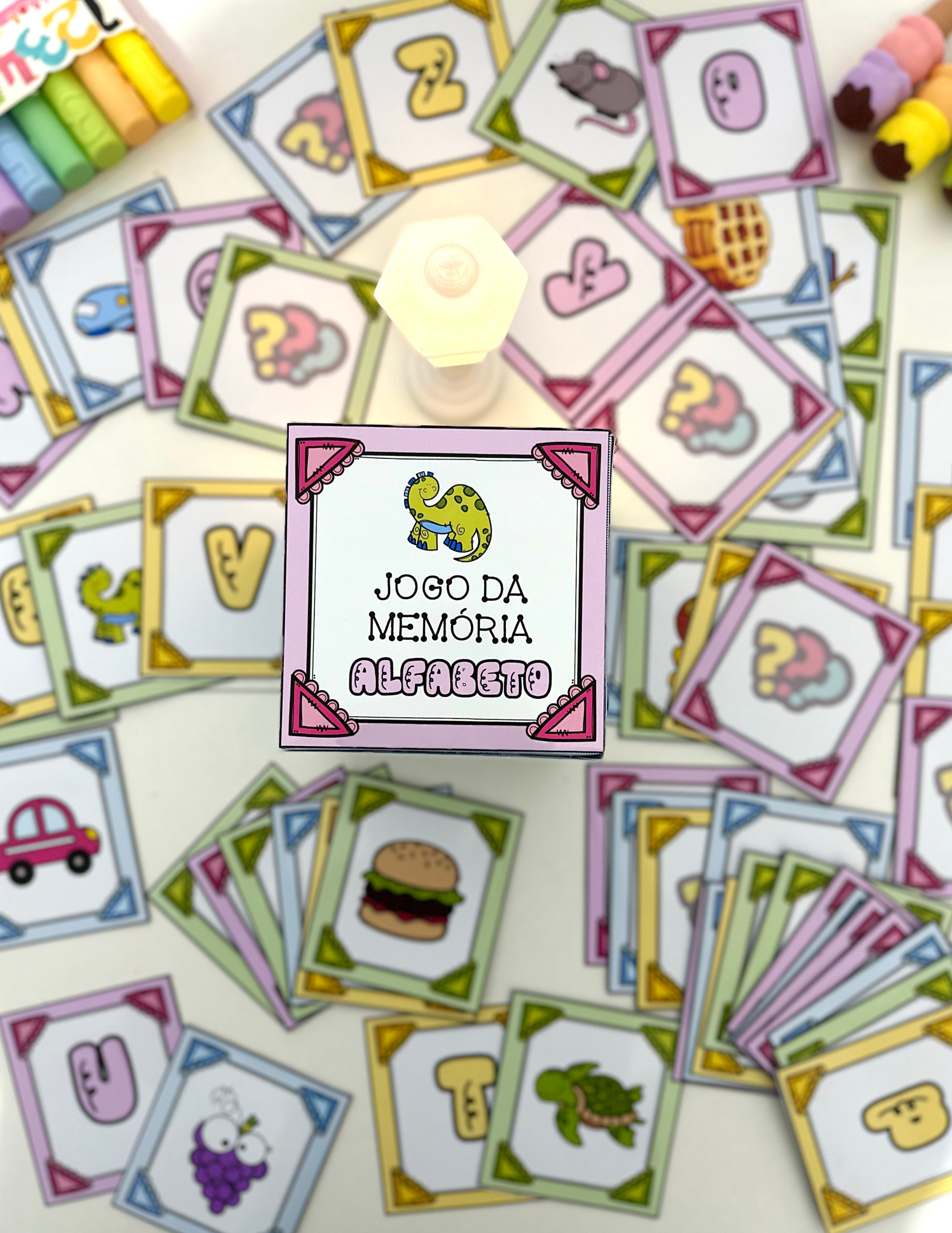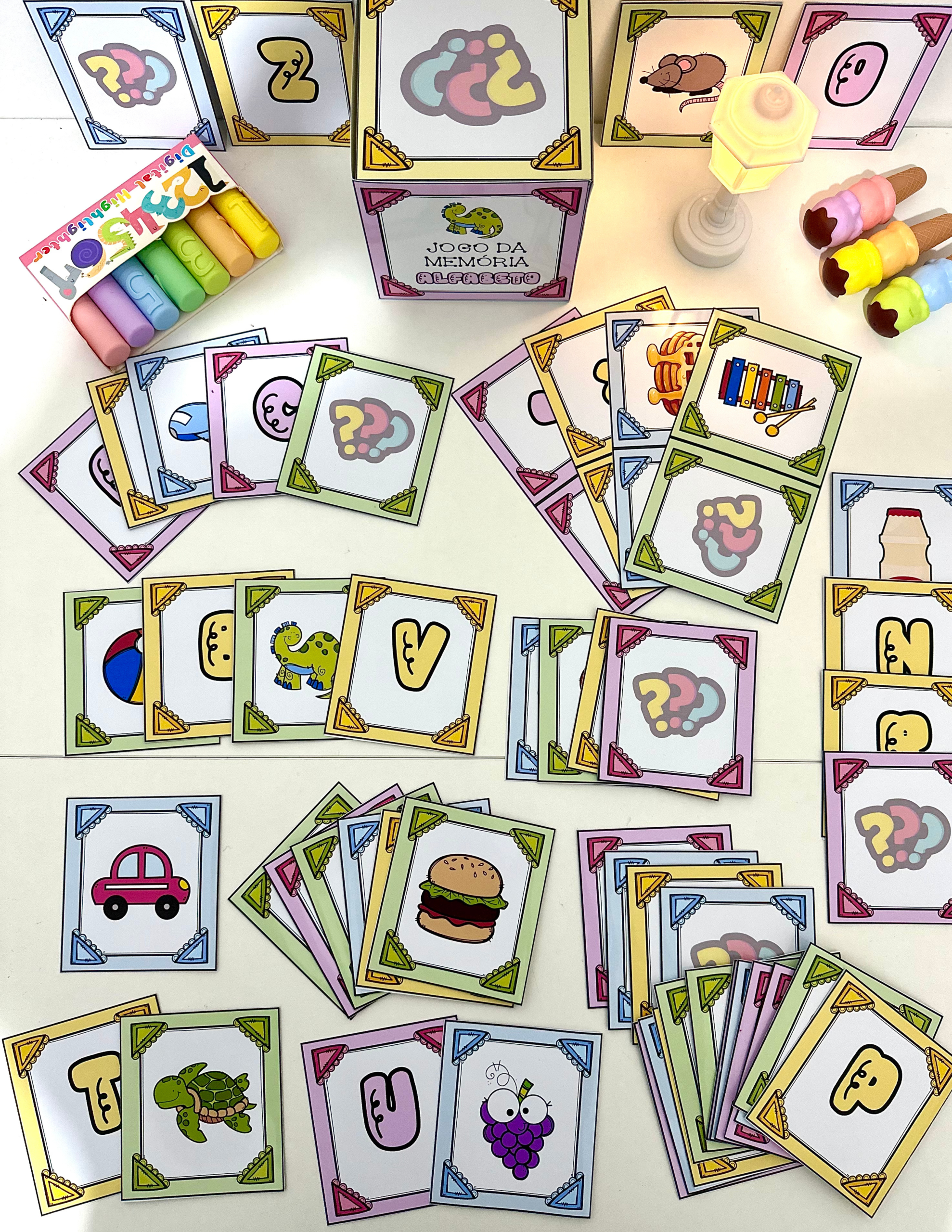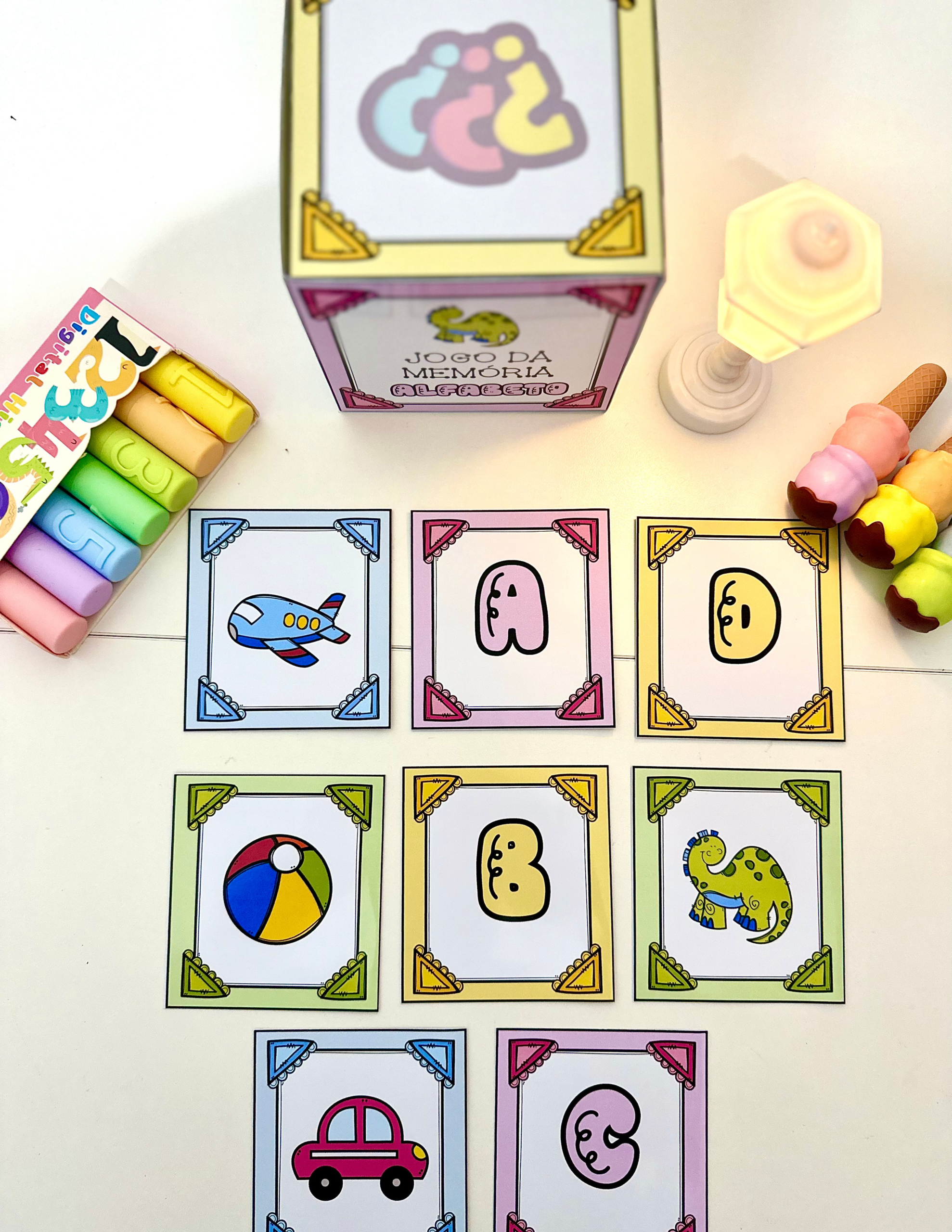 Contém caixa + 52 fichas ilustradas (frente e verso) — 26 letras e 26 figuras para pareamento.