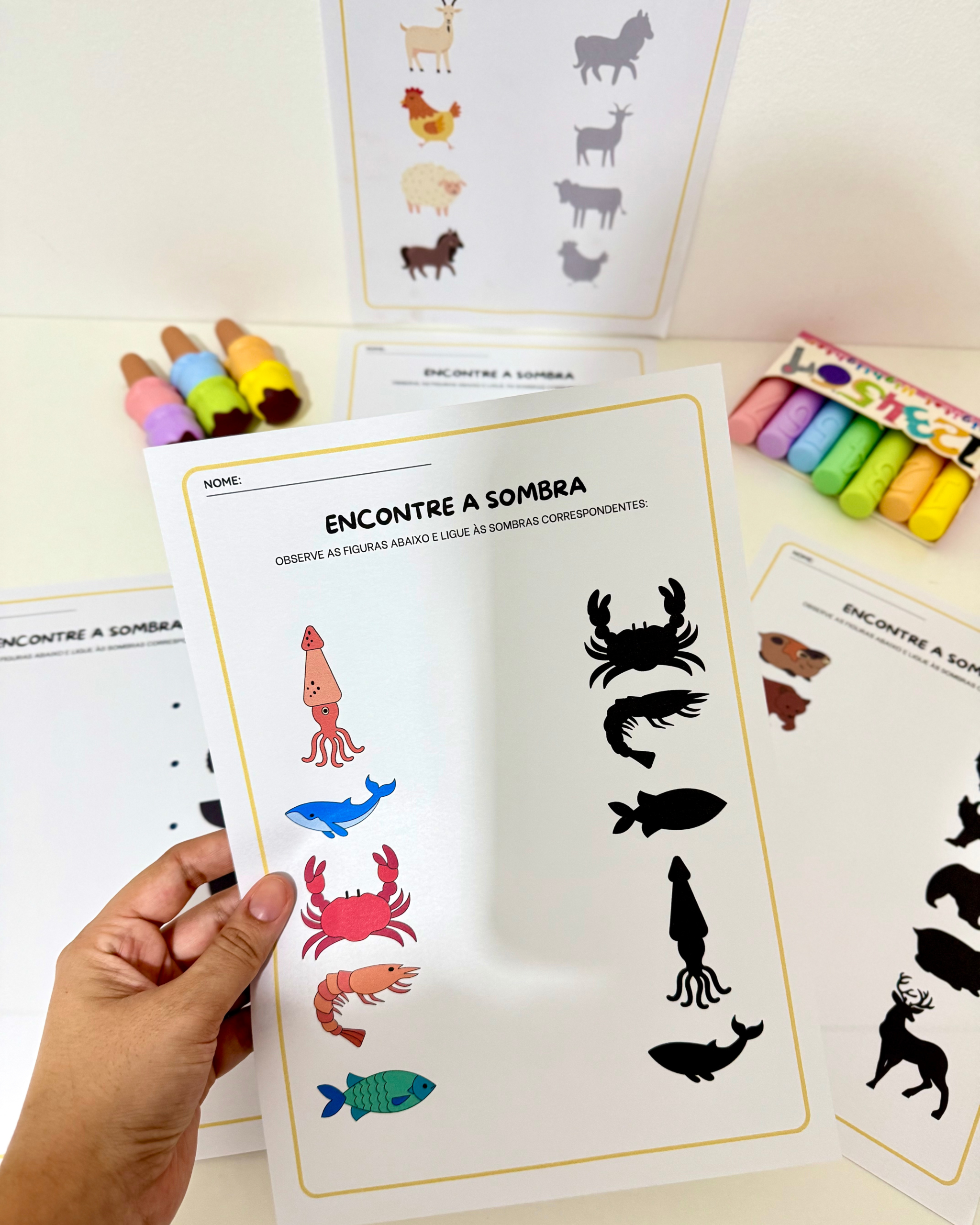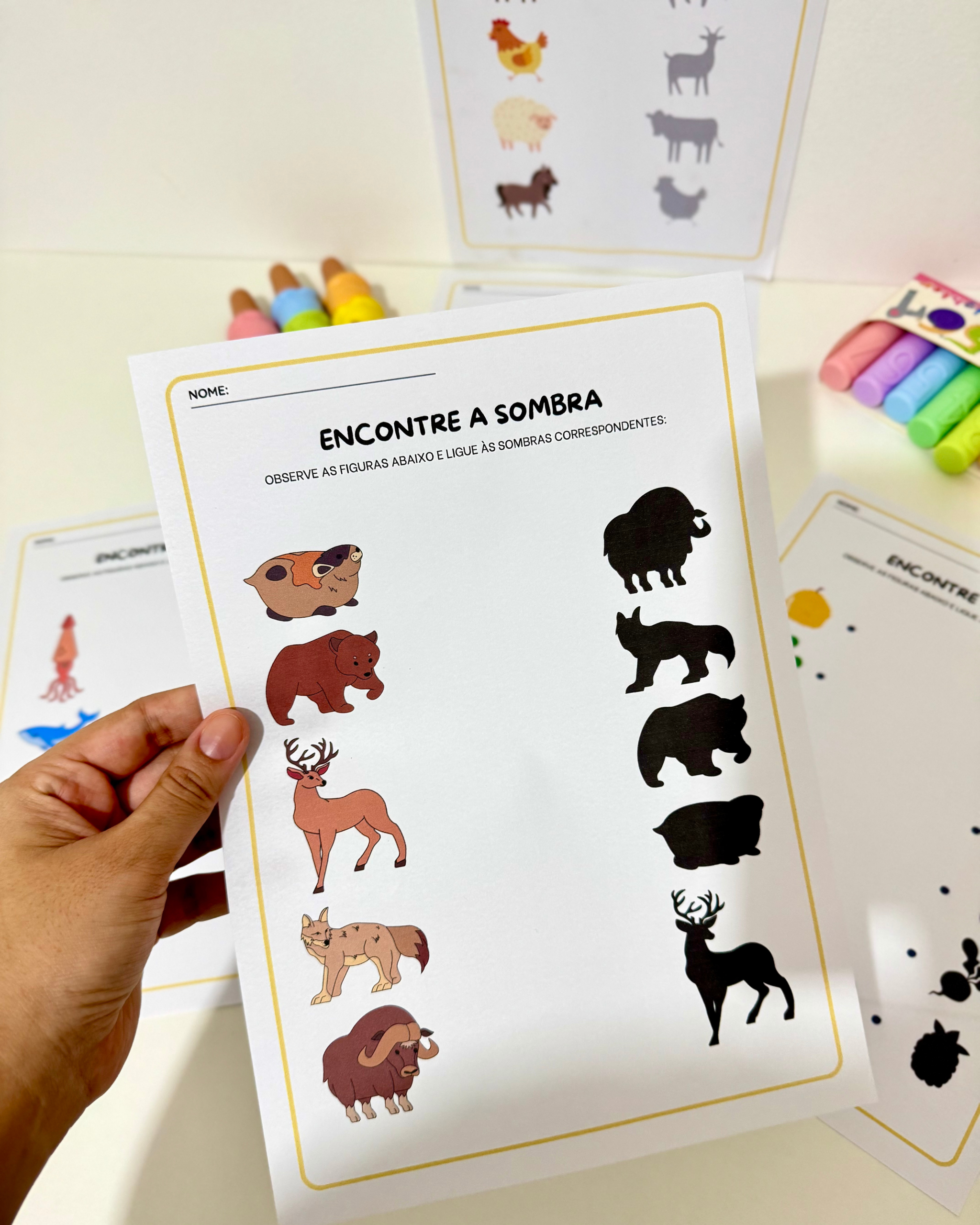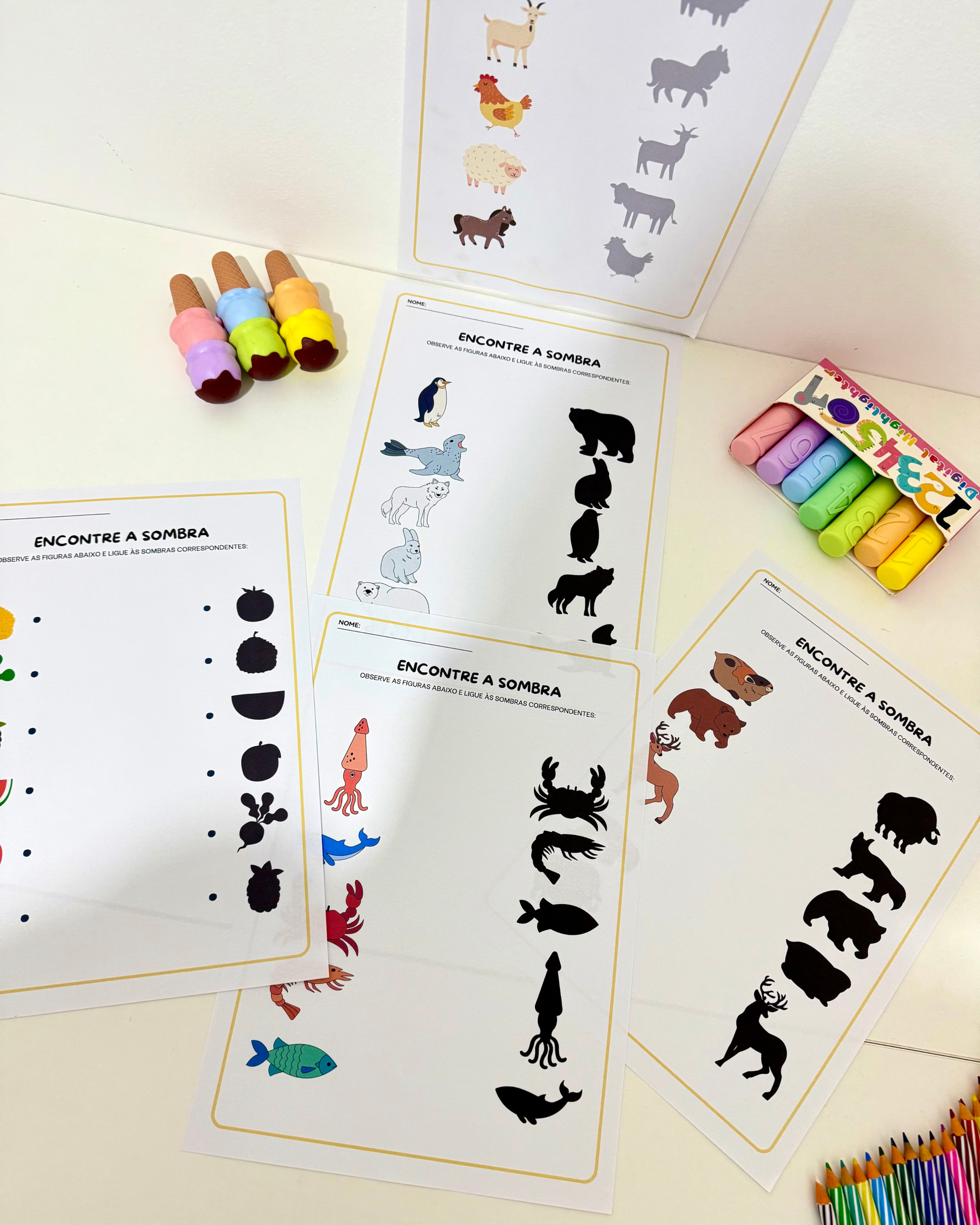 🎨 Sombras Divertidas 🧩 5 atividades em PDF colorido para trabalhar atenção, concentração e percepção visual de forma lúdica! A criança faz o pareamento das figuras com suas sombras e aprende brincando! 🌟