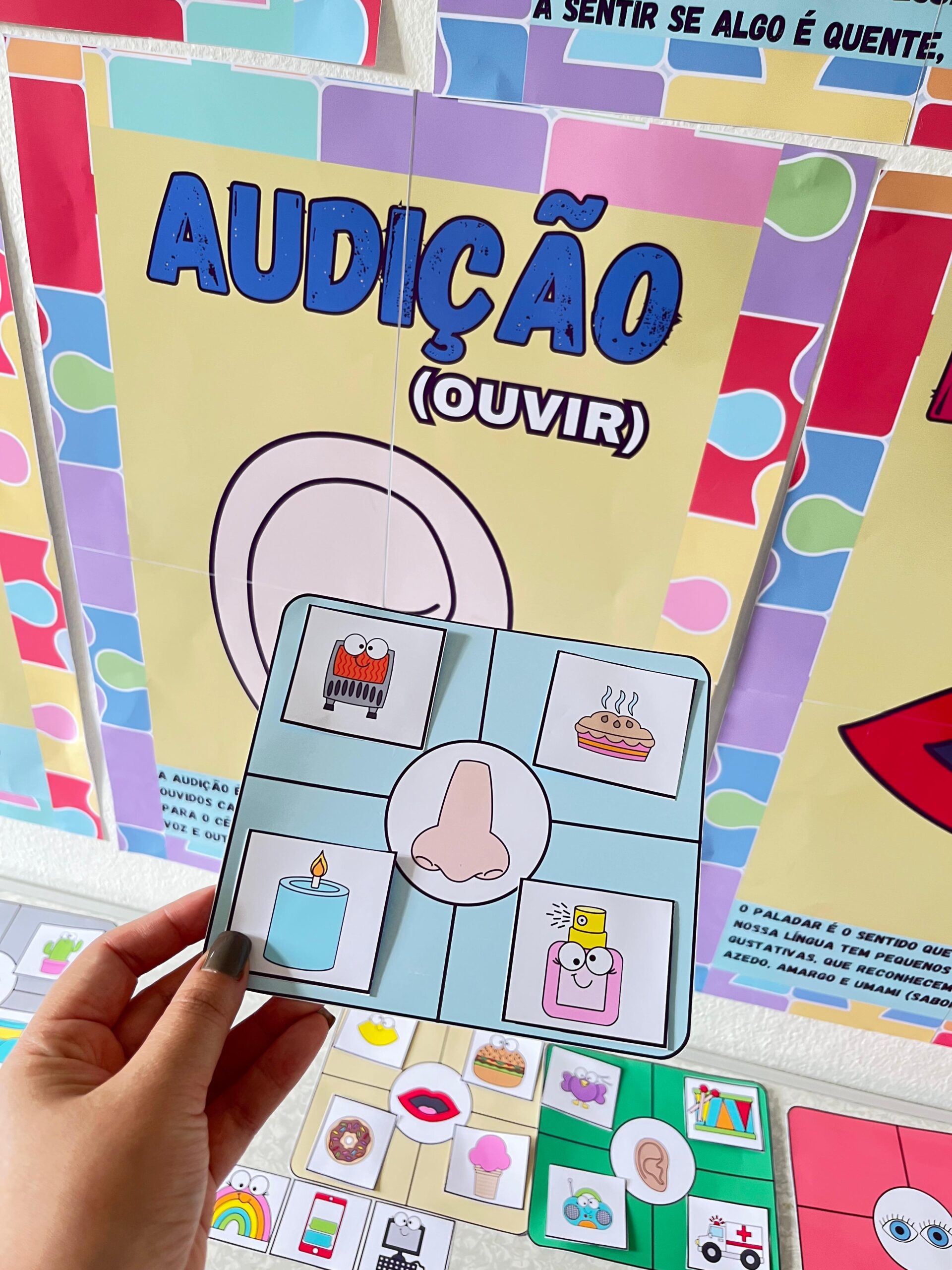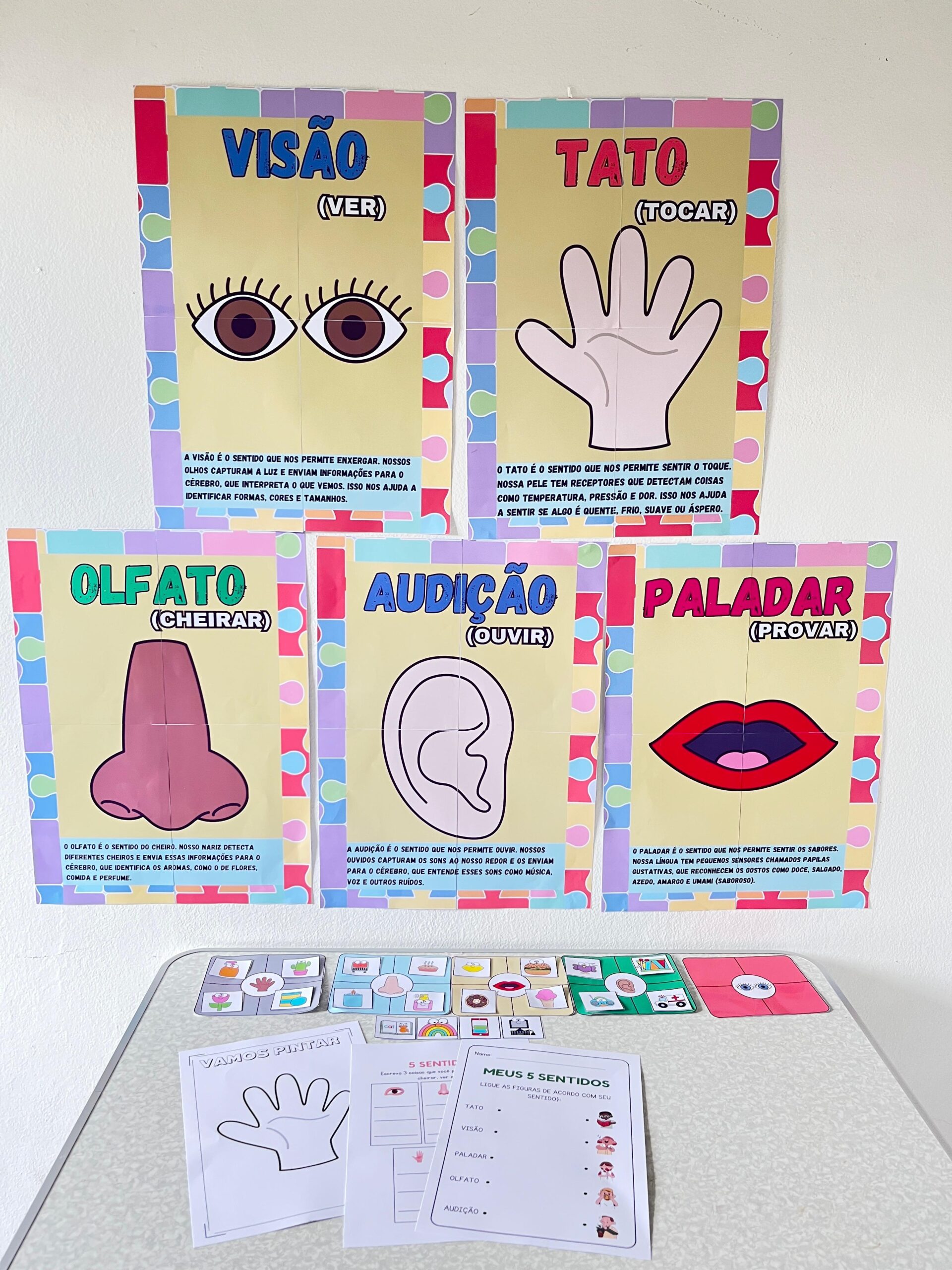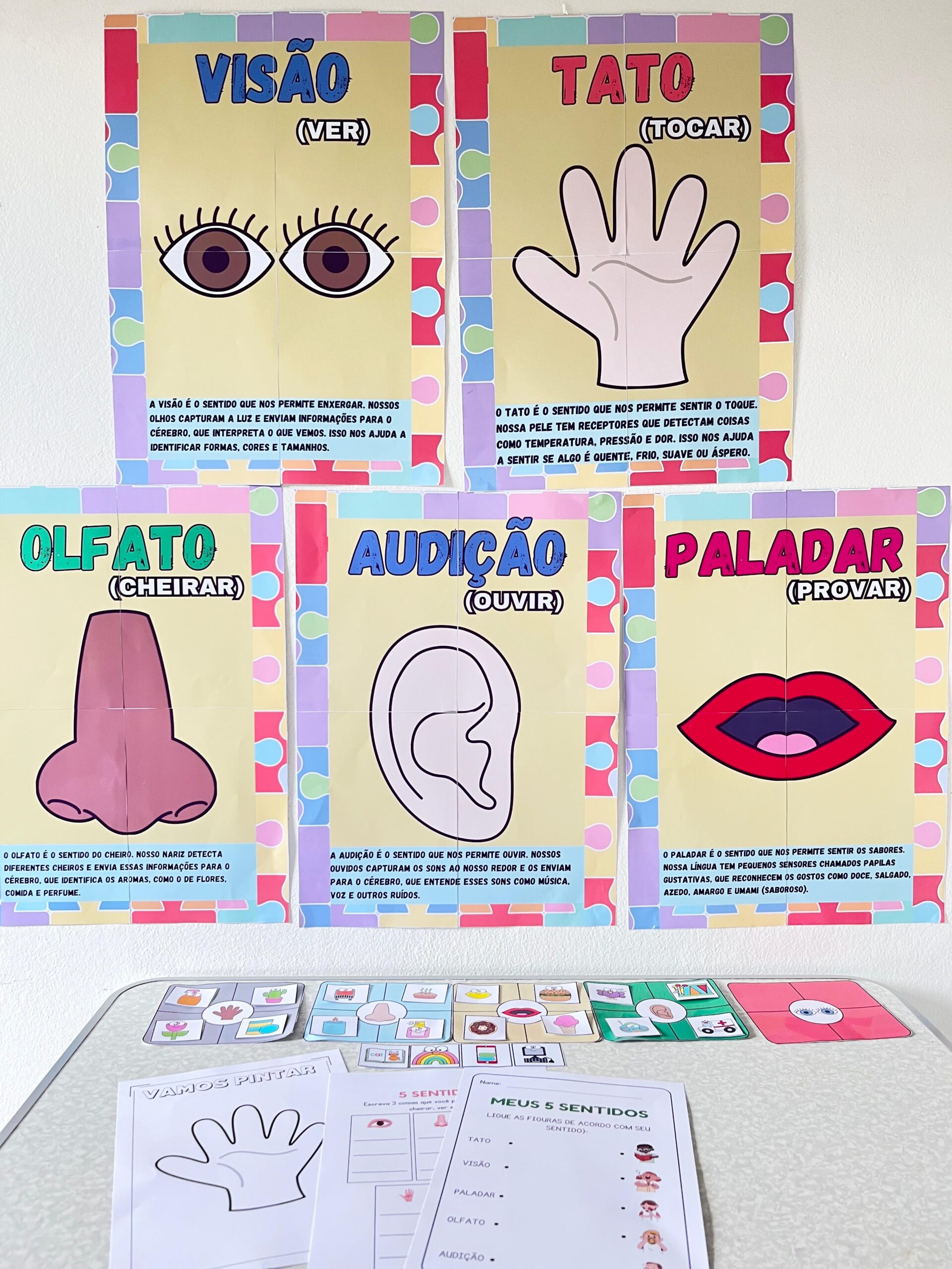 • 5 Cartazes Didáticos: Coloridos e informativos, cada um explicando detalhadamente um dos sentidos.