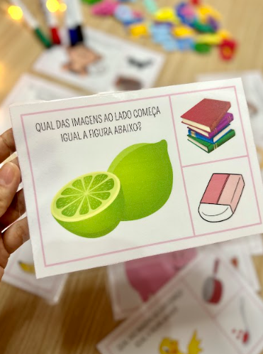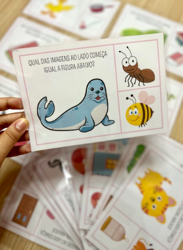 O recurso Aliteração traz 18 fichas para a criança descobrir qual figura começa com o mesmo som da imagem destaque 🔊✨.
