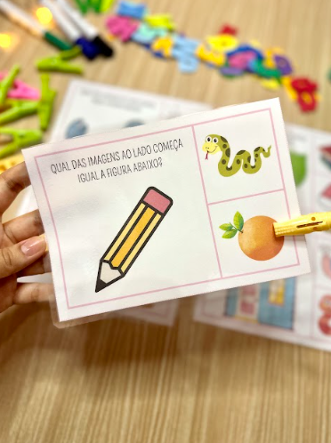 É lúdico, desenvolve a consciência fonêmica e pode ser usado com prendedor ou caneta para quadro branco. Diversão garantida! 😄🎉